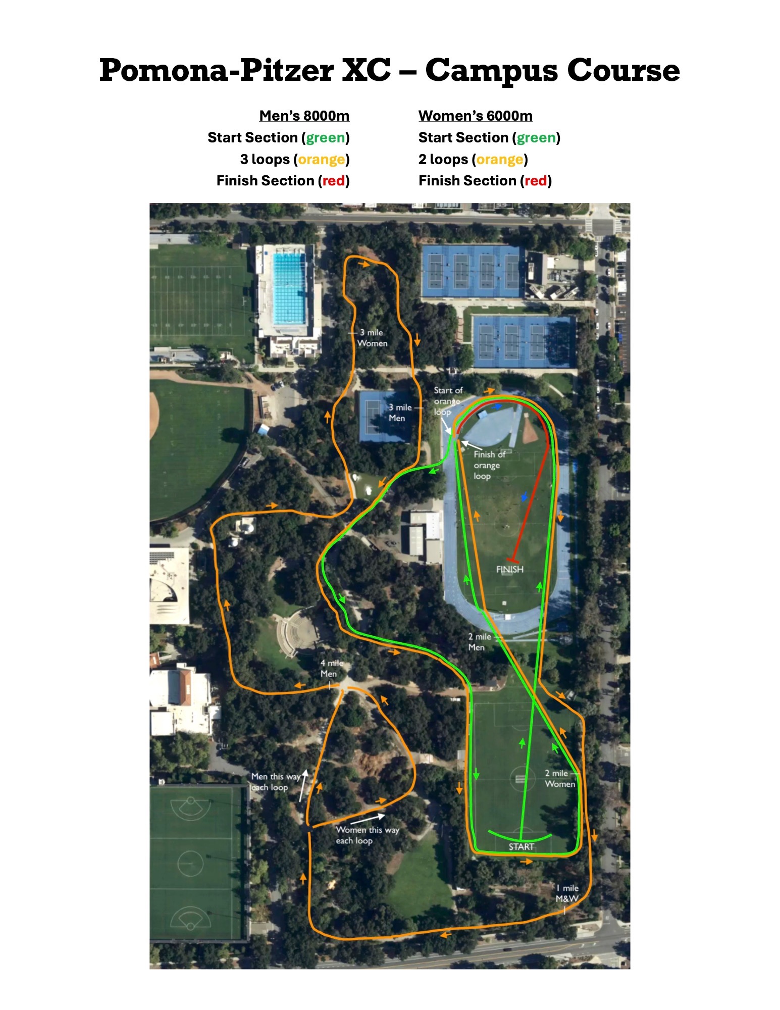 The course is a repeating loop (men: 3 loops, women: 2 loops), plus a start section (lower soccer field) before the loops, and a finish section (blue track) after the loops. COURSE MAP